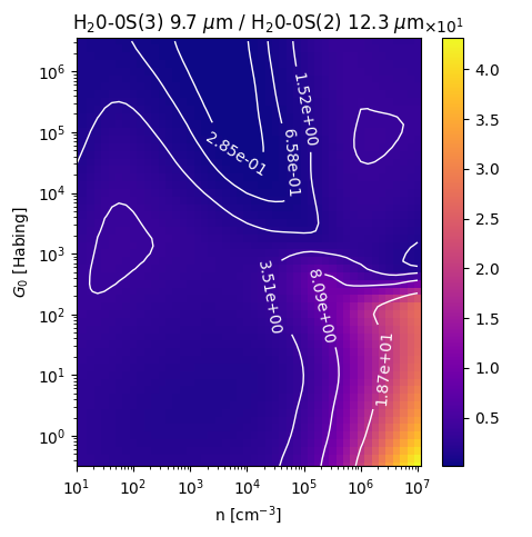 H20-0S(3) 9.7 µm / H20-0S(2) 12.3 µm Intensity Ratio emitted from the surface of a PDR as a function of the cloud density n and the FUV flux incident on the cloud G0. The above model is at a viewing angle of i=75 degrees, where i=0 is face-on. The models in the wk2020 ModelSet are based on Kaufman et al. 2006 , Wolfire et al. 2010, and Neufeld & Wolfire 2016. They use these parameters. More details are in the FITS headers.
