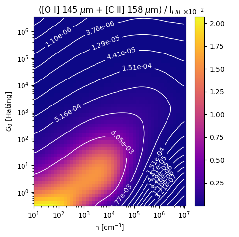 ([O I] 145 µm + [C II] 158 µm) / IFIR Intensity Ratio emitted from the surface of a PDR as a function of the cloud density n and the FUV flux incident on the cloud G0. The above model is at a viewing angle of i=75 degrees, where i=0 is face-on. The models in the wk2020 ModelSet are based on Kaufman et al. 2006 , Wolfire et al. 2010, and Neufeld & Wolfire 2016. They use these parameters. More details are in the FITS headers.