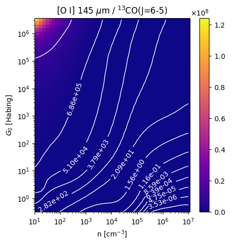 [O I] 145 µm / 13CO(J=6-5) Intensity Ratio emitted from the surface of a PDR as a function of the cloud density n and the FUV flux incident on the cloud G0. The above model is at a viewing angle of i=75 degrees, where i=0 is face-on. The models in the wk2020 ModelSet are based on Kaufman et al. 2006 , Wolfire et al. 2010, and Neufeld & Wolfire 2016. They use these parameters. More details are in the FITS headers.