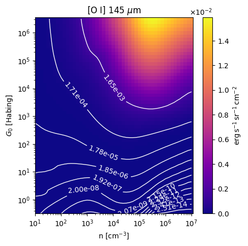 [O I] 145 µm Intensity emitted from the surface of a PDR as a function of the cloud density n and the FUV flux incident on the cloud G0. The above model is at a viewing angle of i=75 degrees, where i=0 is face-on. The models in the wk2020 ModelSet are based on Kaufman et al. 2006 , Wolfire et al. 2010, and Neufeld & Wolfire 2016. They use these parameters. More details are in the FITS headers.