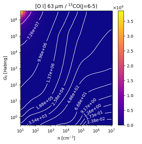 [O I] 63 µm / 13CO(J=6-5) Intensity Ratio emitted from the surface of a PDR as a function of the cloud density n and the FUV flux incident on the cloud G0. The above model is at a viewing angle of i=75 degrees, where i=0 is face-on. The models in the wk2020 ModelSet are based on Kaufman et al. 2006 , Wolfire et al. 2010, and Neufeld & Wolfire 2016. They use these parameters. More details are in the FITS headers.