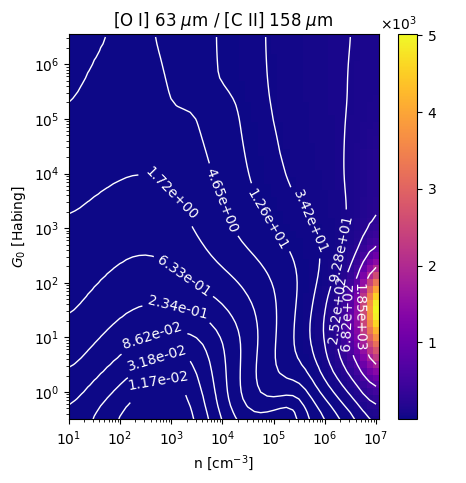 [O I] 63 µm / [C II] 158 µm Intensity Ratio emitted from the surface of a PDR as a function of the cloud density n and the FUV flux incident on the cloud G0. The above model is at a viewing angle of i=75 degrees, where i=0 is face-on. The models in the wk2020 ModelSet are based on Kaufman et al. 2006 , Wolfire et al. 2010, and Neufeld & Wolfire 2016. They use these parameters. More details are in the FITS headers.